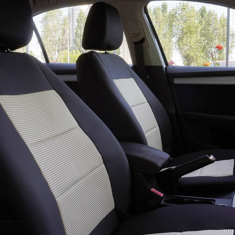 Huse scaune auto din material textil dublu laminat, similar cu tapiteriile originale, cu insertii de piele ecologica si ambele fete dublate cu burete (grosime 5mm).